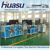 FETURES; -High performance single screw extruder with special screw ensure good extrusion -Special structure die make the thickness of the interior and exterior wall even, and stable molding. In addition, the thickness of interior and exterior can be adjusted. -High performance vertical/shuttle corrugators ensure the pipe of good quality and high efficiency -With special and accurate forming module; cooling air and water system guarantee the production speed fast. -With single wall belling inline system -With special aluminum alloy mould bolck with anti-adhereing treatment, cooling air, cooling water and vacuum channel inside of mould block ensure good forming structure of pipe and speed. Inroduction of Pipe -Compared with metal, ceramic, concrete and other pipes, double wall corrugated pipe has many advantage such as lower weight, lower cost, easy to connect, due to the special structure of double wall corrugated pipe. So it is used widely for sewerage and drainage system, cable protection system